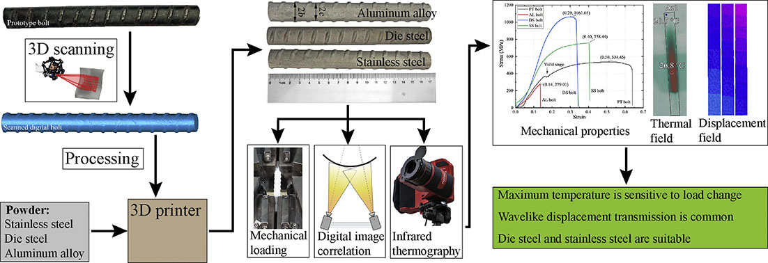 - Abstract:This study selects 3D printing to innovate traditional research approaches regarding bolting. Three bolts composed of different manufacturing materials—aluminum alloy (AL), die steel (DS) and stainless steel (SS)—are successfully 3D printed, and the desired geometric profile is achieved with high precision. Prior to printing, the digital file of the prototype (PT) bolt is obtained by a 3D laser scanning system. Afterwards, mechanical tensile tests, infrared thermography (IRT) tests and digital image correlation (DIC) tests are carried out. The mechanical testing results indicate that the peak strength of the DS bolt is approximately twice that of the PT bolt. The IRT results show that the maximum temperature on the surface of all bolts except the AL bolt increases as the load increases, and the minimum temperature on the bolt surface is barely impacted by loading. DIC indicates a feasible relationship between the load and strain for the PT bolt, AL bolt and DS bolt. Overall, the AL bolt is not suitable for replicating the PT bolt, whereas the DS bolt and SS bolt are suitable choices. The conclusions established in this study provide new measures for future research regarding laboratory bolting tests and even engineering bolting trials.