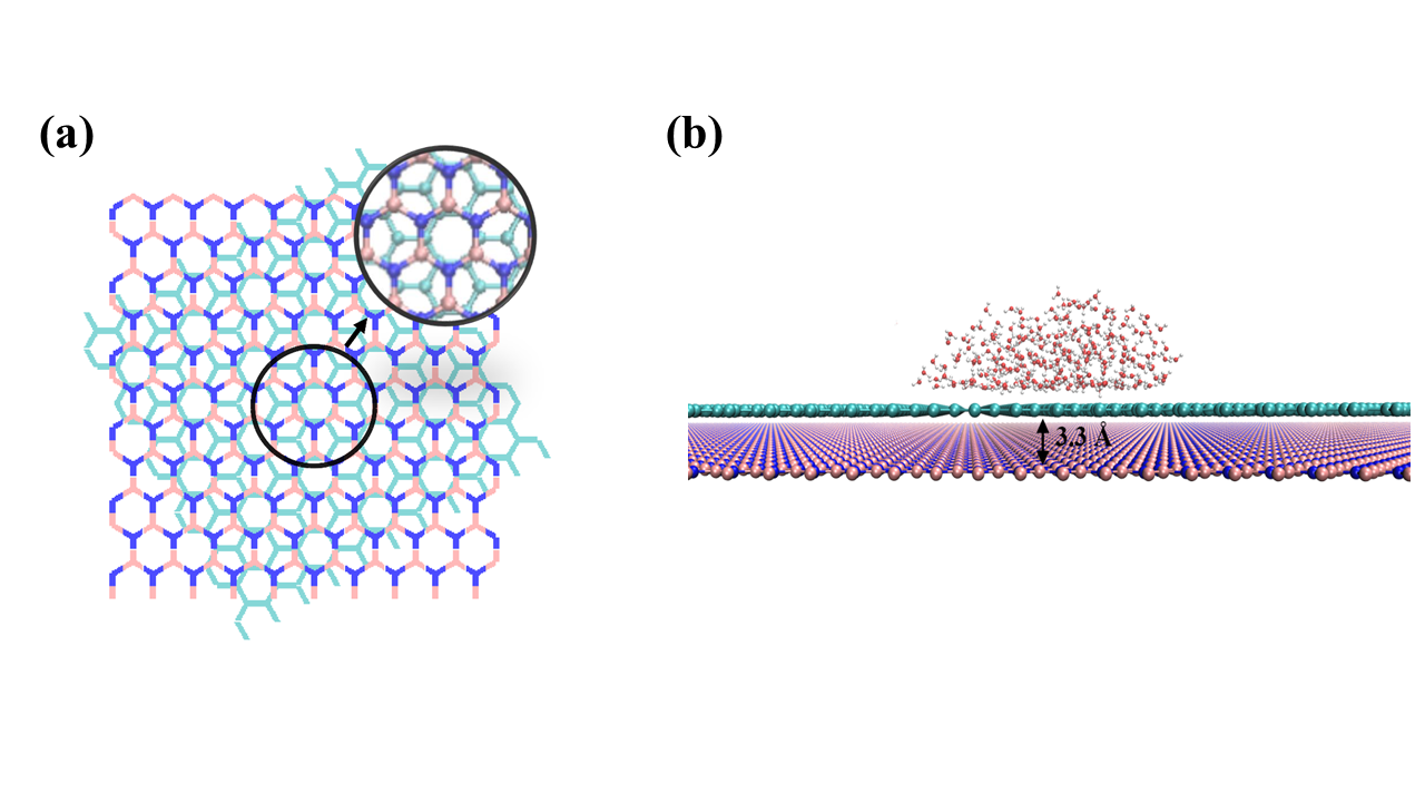 摘要:The graphene/h-BN heterostructure provides a promising device for biomedical applications and biosensor. However, the friction characteristics of water on graphene/h-BN are still elusive. By means of molecular dynamics simulations, we investigated the friction coefficient of water on both sides of graphene/h-BN heterostructures under various rotation angle, which shows a non-monotonic but symmetrical variation with relative interlayer angle. Despite that friction coefficient of h-BN surface is larger than that of graphene, as the rotation angle increases, the friction coefficient of water on both sides of the graphene/h-BN heterostructure exhibits the same “M”-shaped curve. The center of symmetry of the curve is at the rotation angle of 30°; the friction coefficient is the largest when the rotation angle is 10° and 50°. It was found that graphene/h-BN heterostructure is a device whose friction coefficient is different on both sides and can be adjusted by twisting the relative interlayer angle. These results could be demonstrated by the van der Waals interaction and different pattern of free energy landscape. These findings provide detailed insights into the mechanism of the friction property of water at nanoscale, which would facilitate feasible applications of graphene/h-BN heterostructure in biosensor and biomedicine.