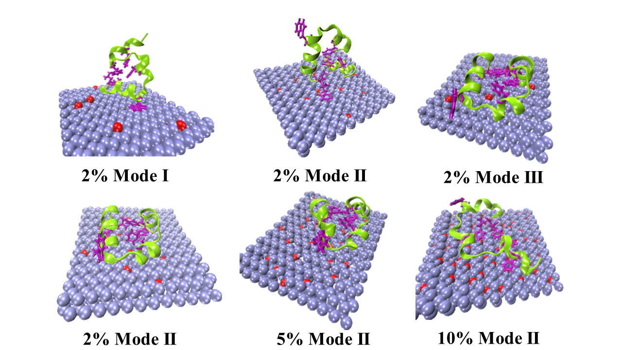 摘要:Phosphorene, a novel member of the two-dimensional nanomaterial family, has demonstrated great potential in biomedical applications, such as photothermal therapy, drug delivery and antibacterial. However, phosphorene is unstable and easily oxidized in an aerobic environment. In this paper, using larger-scale molecular dynamics simulations, we investigated the disruption of phosphorene oxide (PO) to the structure of a model protein, villin headpiece subdomain (HP35). It shows that the disruption of PO nanosheets to the protein structure is enhanced with increasing oxidation concentration of PO, while PO's oxidation mode has very little effect on the PO–HP35 interaction. PO with a low oxidation concentration has certain biocompatibility to HP35. Oxygen atoms filling into the groove region in the puckered surface of phosphorene enhance the dispersion interaction between phosphorene and HP35, which enhances the disruption of phosphorene to the structure of HP35. Compared with the dispersion interaction, the electrostatic interaction between PO and the protein has a negligible effect on the structural damage of HP35. These findings might shed light on the biological toxicity of PO nanosheets and would be helpful for future potential biomedical applications of PO nanosheets, such as nanodrugs and antibacterial agents.