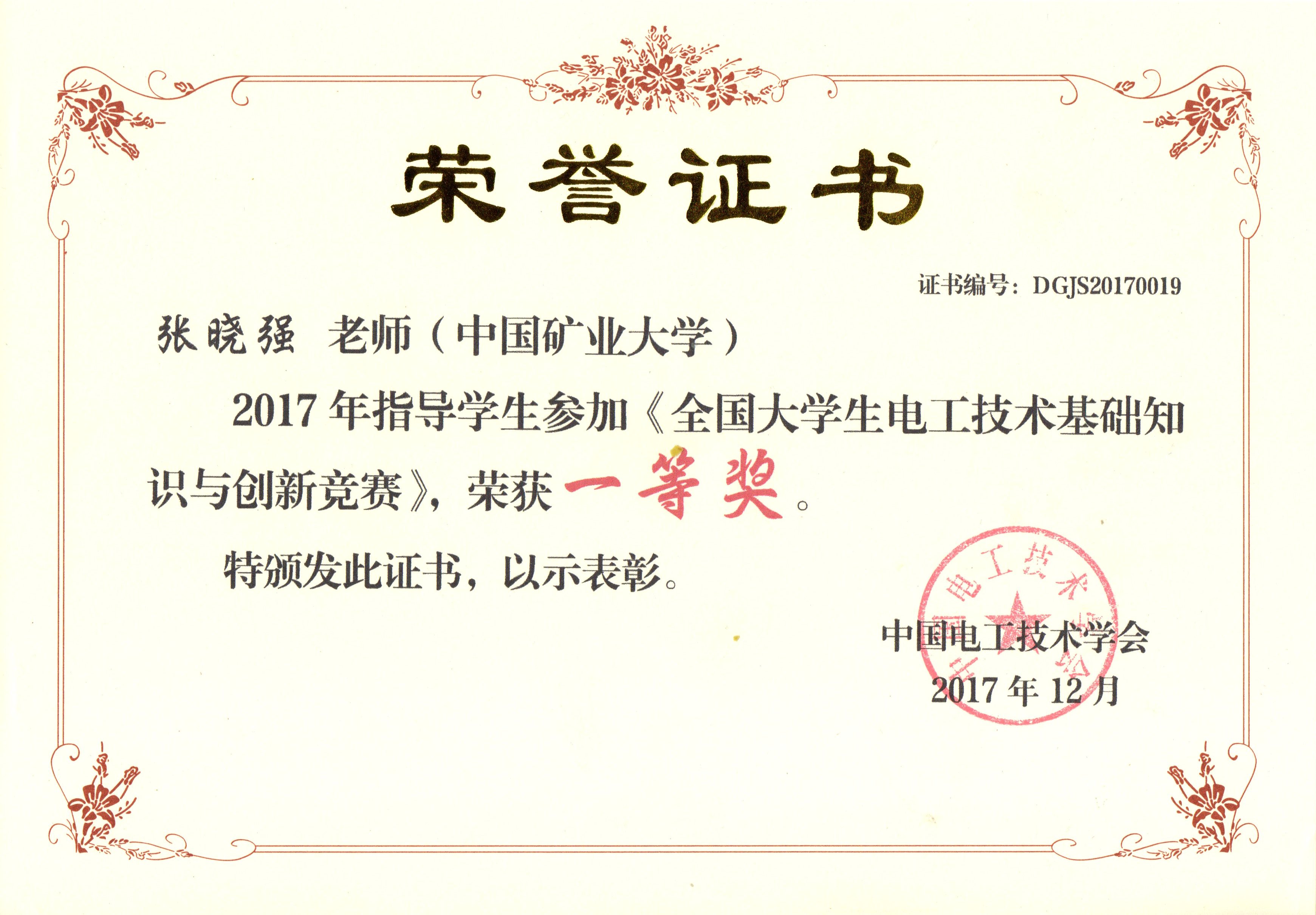 指导学生参加《全国大学生电工技术基础知识与创新竞赛》荣获一等奖