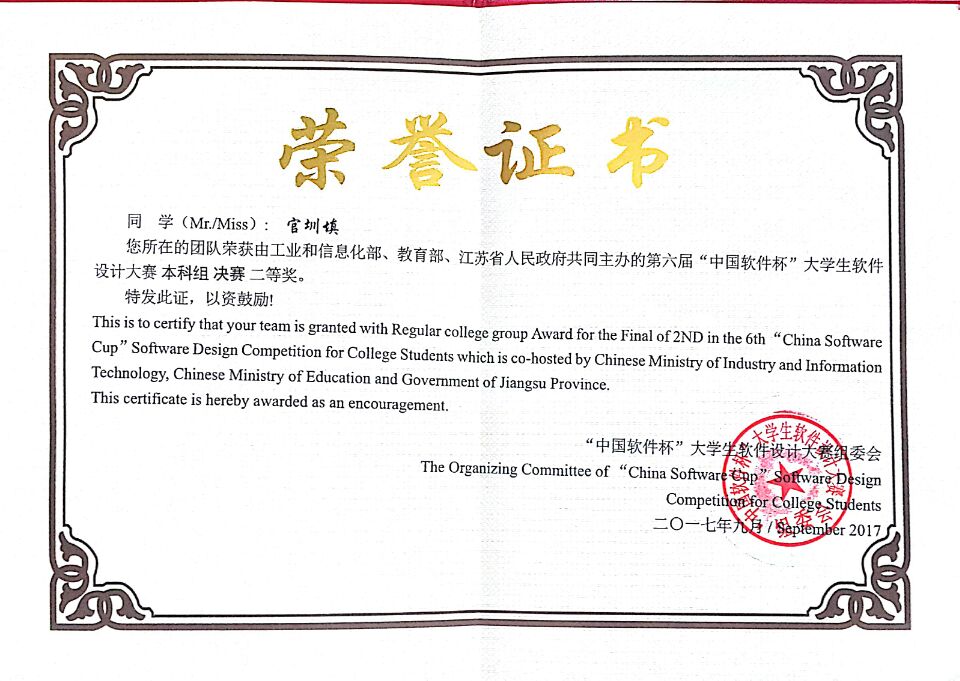官圳填、王乙文、蔡雨豪获第六届“中国软件杯”全国二等奖