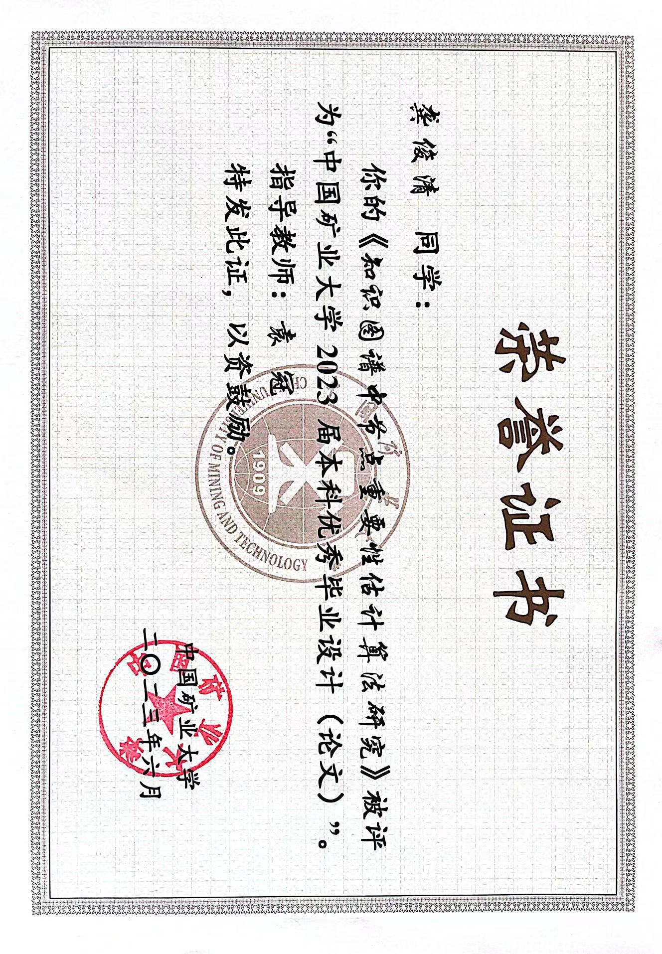 龚俊清获中国矿业大学2023年优秀本科毕业论文(设计)