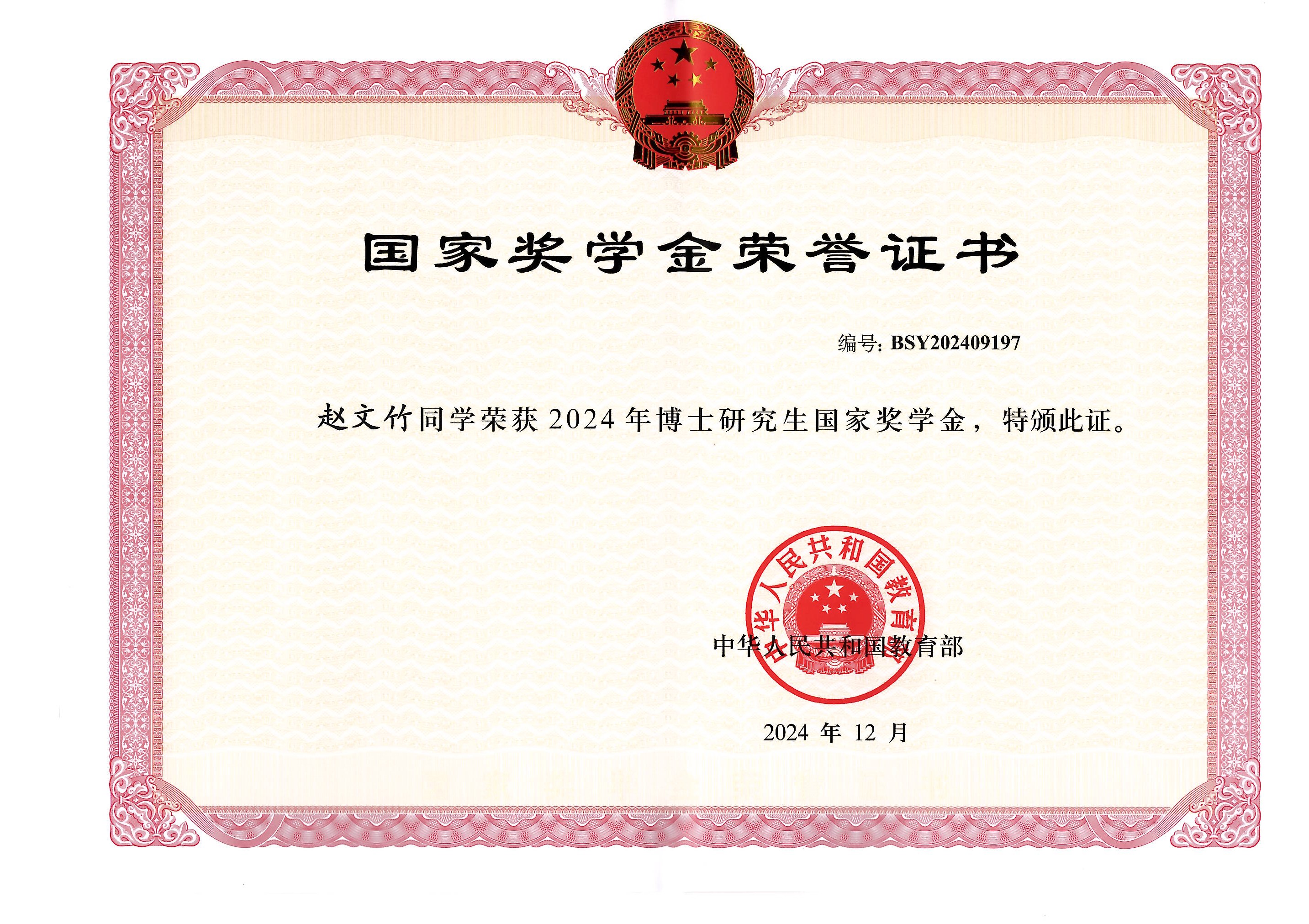 赵文竹获2024年博士研究生国家奖学金(2021级博士生)