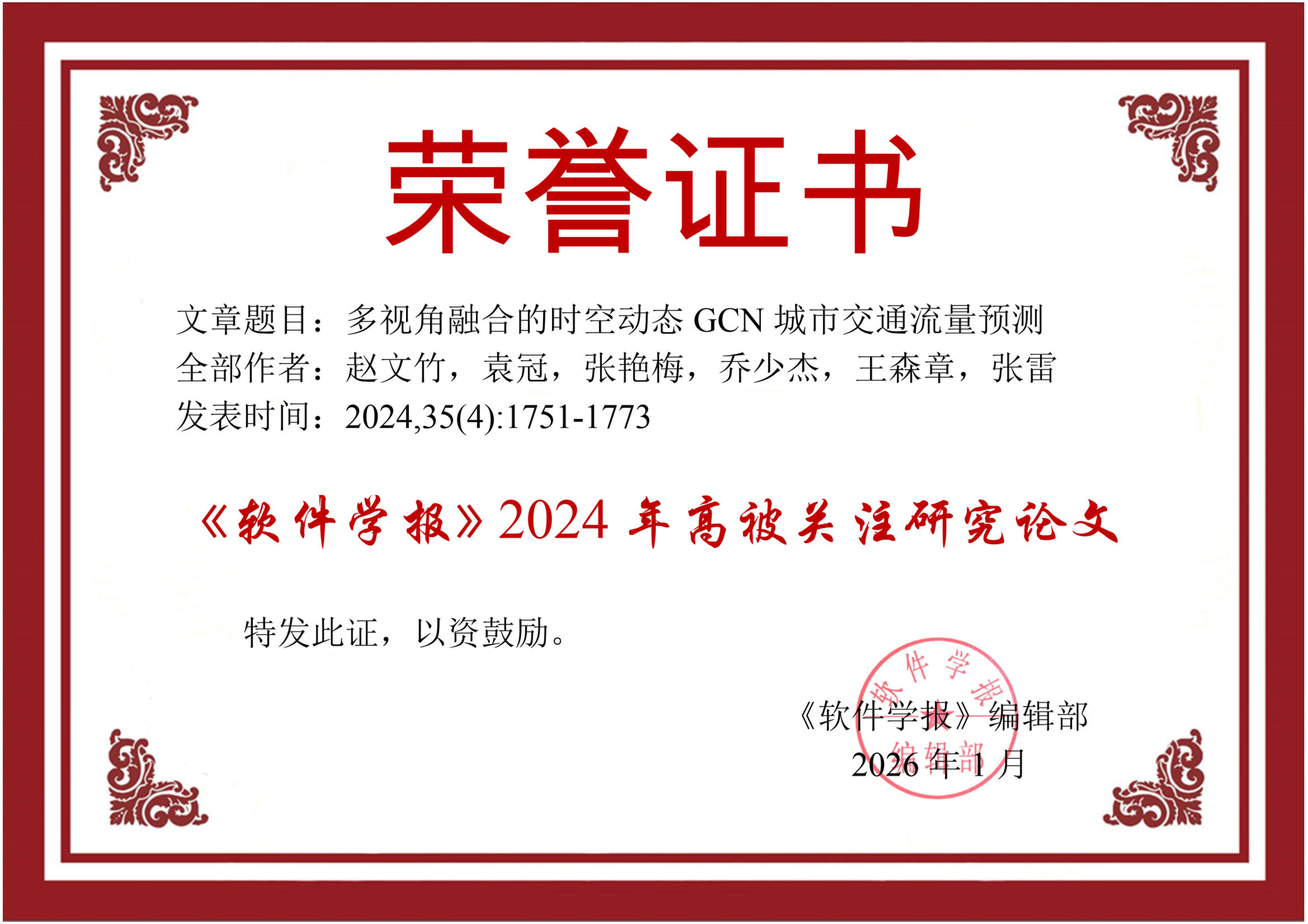 多视角融合的时空动态图卷积网络城市交通流量预测,软件学报,2024 ,35(4):1751-1773. 获 软件学报 2024年度高被关注研究论文。