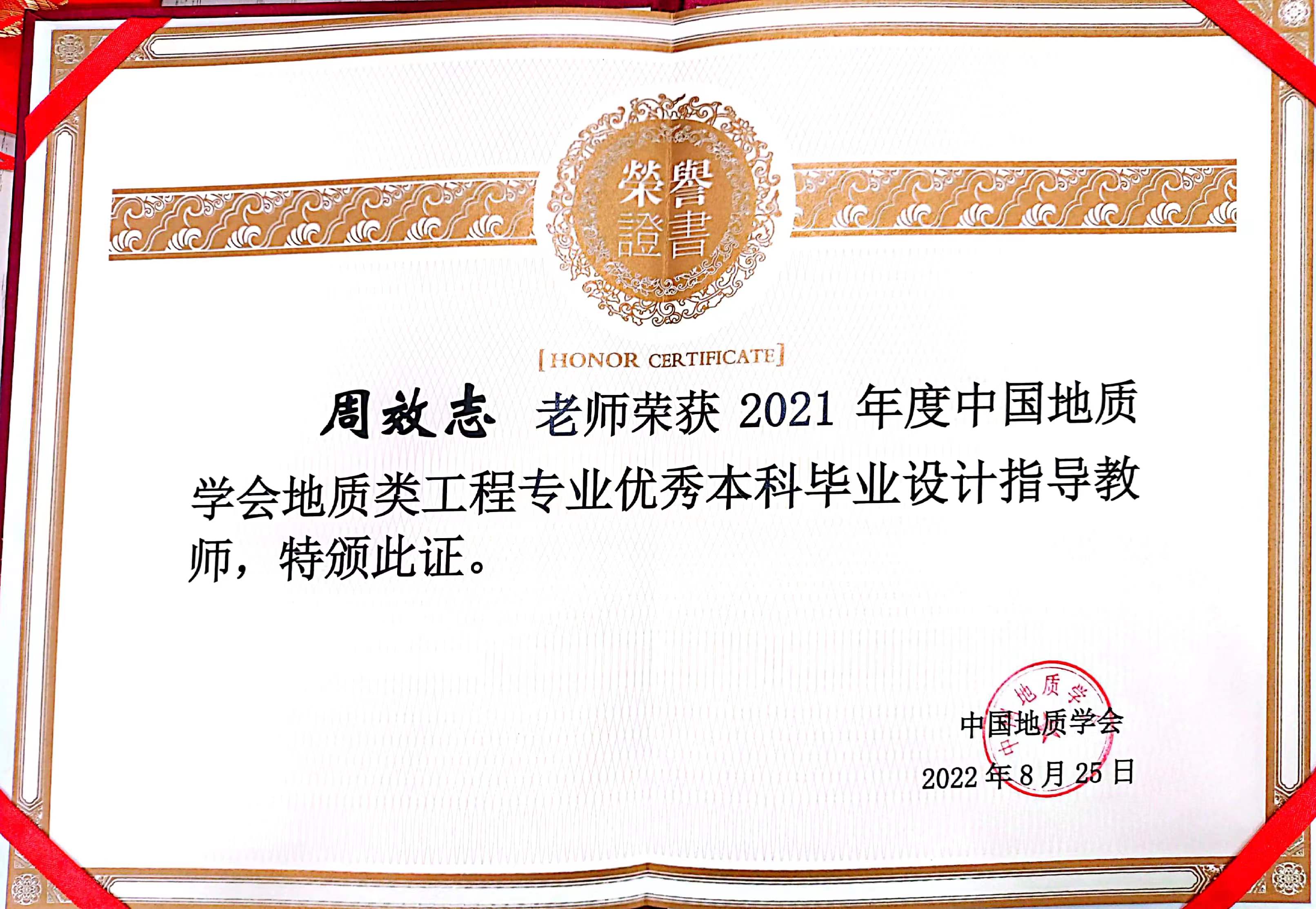 2021年度中国地质学会地质类工程专业优秀本科毕业设计指导教师(周效志)